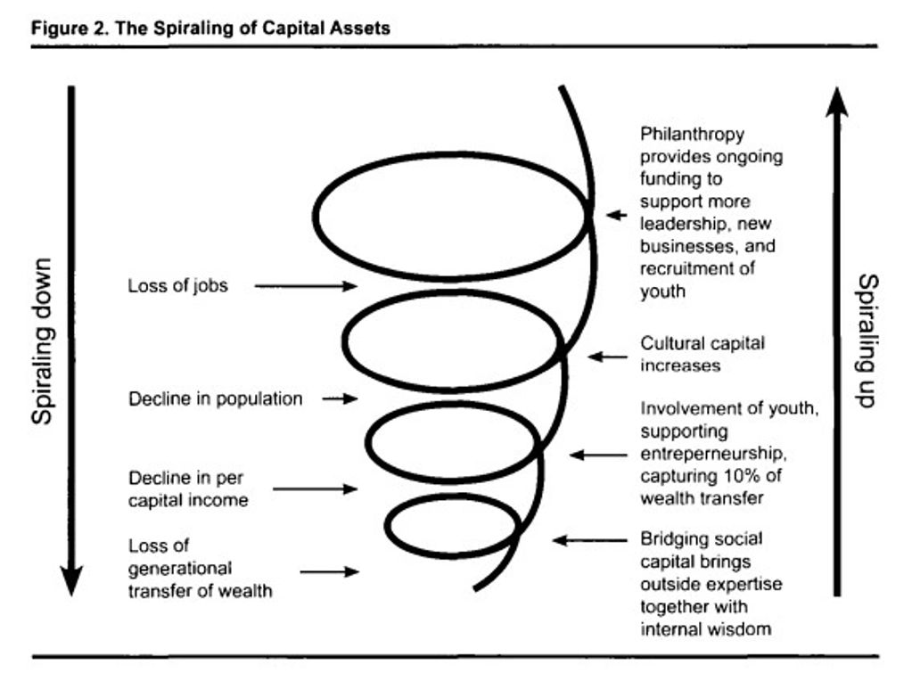Figure 16. An illustration on how communities “spiral down,” starting with loss of jobs, and then how they can “spiral up,” starting with bringing together “outside expertise” and “internal wisdom” of community members (Emery and Flora, 2006).